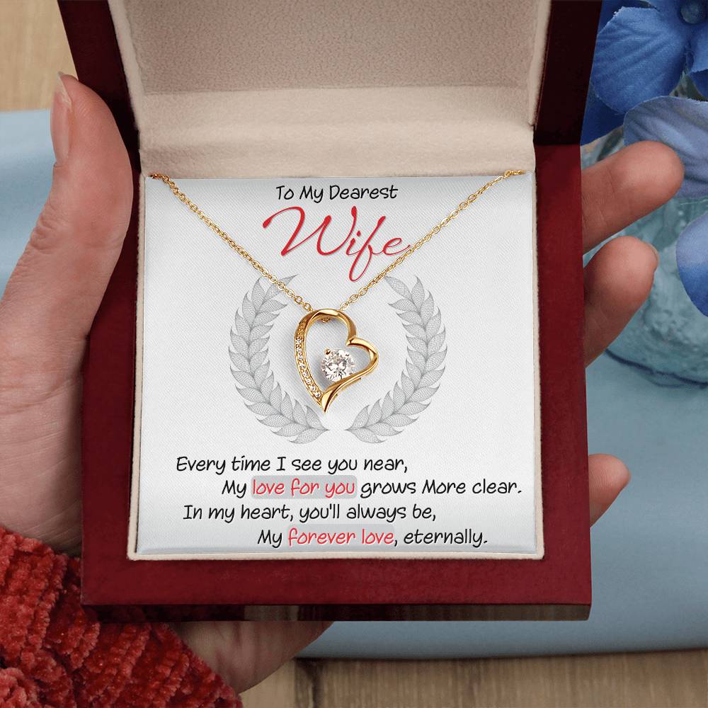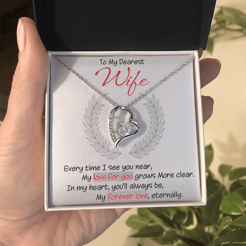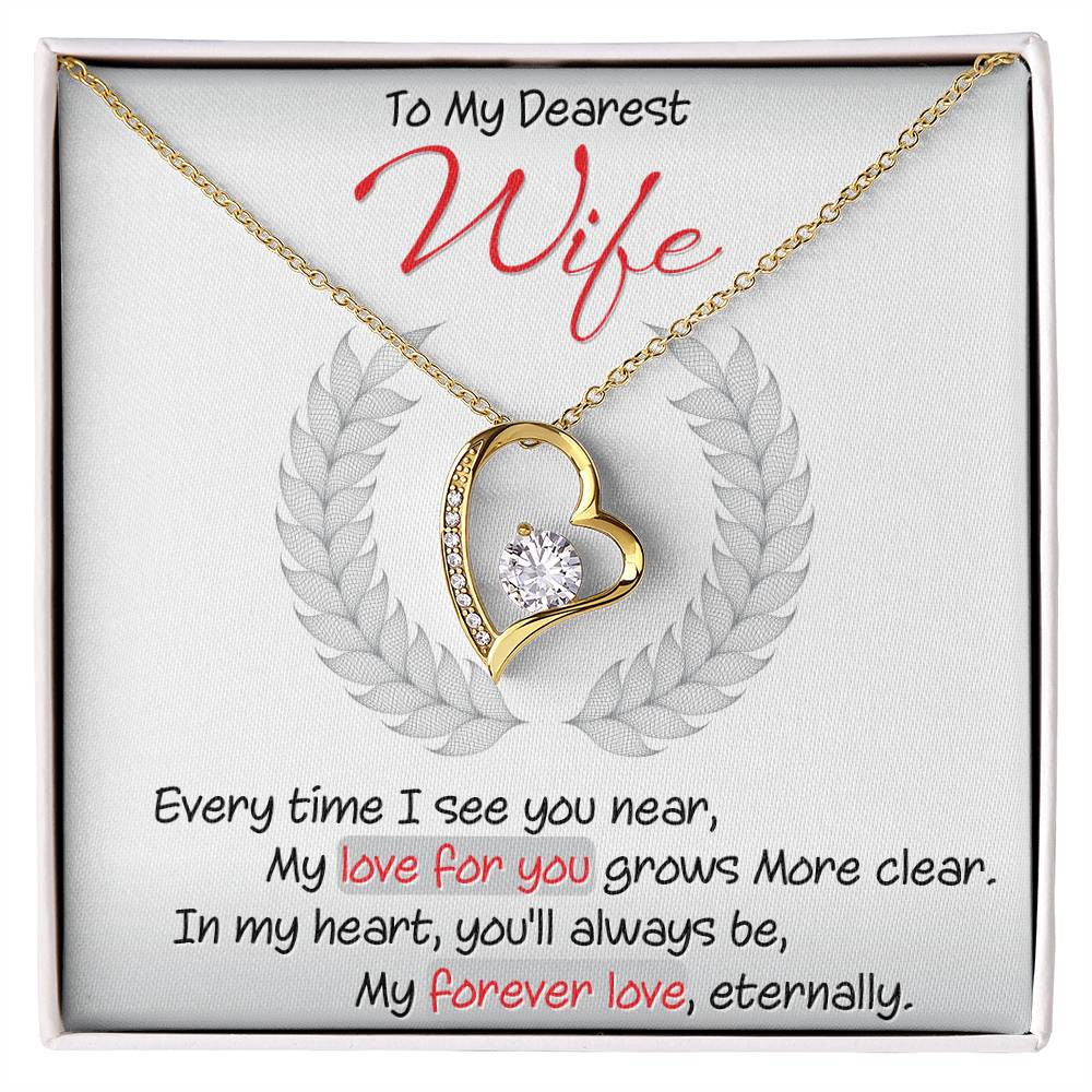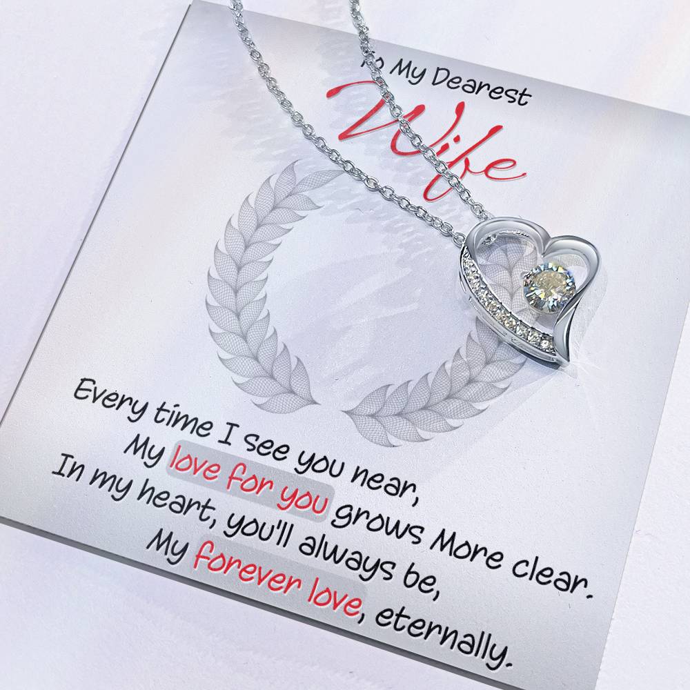 Surprise your wife with the perfect gift she’ll treasure forever. Our Forever Love Heart Necklace, crafted in 14k white gold or 18k yellow gold over stainless steel, is the ideal gift for your wife on any special occasion. The stunning cubic zirconia pendant symbolizes the unbreakable bond between two souls.